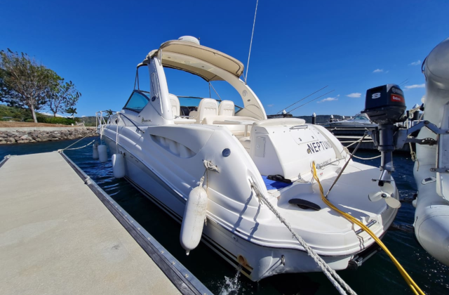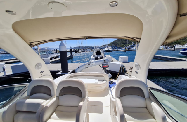 The luxury interior matches the well outfitted and luxury exterior. With comfortable seating areas in the back of the boat, and an air conditioned interior saloon, with private bathroom, living room area, frig and a large bed, the Don Johnny is a perfect boat for those interested in comfort and exploration at the same time. High quality sound system, radar, leather seating, fish finder, marine radio and sonar and radar are part of the state of the art equipment this boat has.