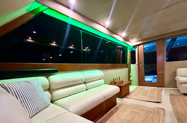 - Entertainment: Bluetooth speaker system, TV, onboard WiFi, and a spacious padded bow deck for lounging. The flybridge offers seating for 10 alongside the captain, while the upper deck makes a great jumping-off point for a refreshing swim.